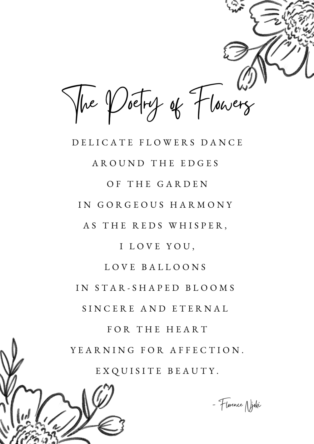 "Delicate flowers dance around the edges of the garden in gorgeous harmony as the reds whisper, I love you, love balloons in star-shaped blooms..." - Florence Njoki.